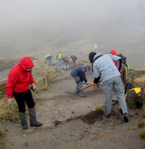 Du sommet du puy de la Perdrix, nous apercevons notre premier chantier. Le sentier descend en pente raide, les renvois d'eau sont aplanis, leurs pierres ont été bousculées par les randonneurs. Equipés de nos pelles et de nos pioches, nous replaçons les pierres déchaussées, rapportons de la terre et creusons les canaux d'eau, tout en veillant à ne pas créer de flaque.