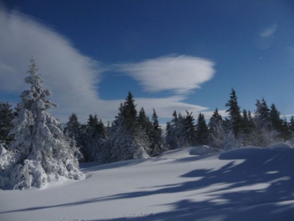 Dimanche matin, elle nous nargue : impossible de skier, rando compromise, envie de raquetter – non – racketter quelques bribes de ce soleil dominical dont l'absence nous conduit tout droit vers le « Lac du Pêcher ». Des recherches sur la Toile d'une éventuelle légende du lac restent sans résultat, supplantées en revanche par de multiples publicités qui font la promotion de l'« ecolodge attitude » du lieu. Nous faisons le tour du lac ou presque.