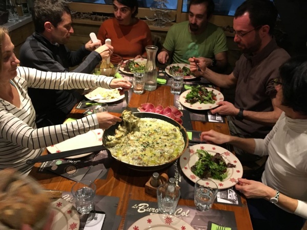 Soirée sympa au buron de la Croix Saint-Robert, une adresse très cosy, où l'on peut se détendre devant la cheminée, avachis dans des canapés pleins de coussins. C'est le lieu idéal pour un excellent vin chaud, une délicieuse truffade persillée accompagnée de charcuterie du pays et de belles tartes aux myrtilles. On a profité de tout !