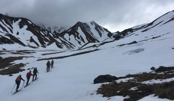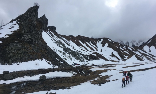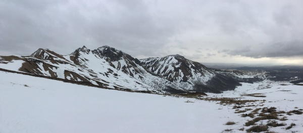 On s'équipe au parking du chalet du Sancy - en dessous de la station du Mont-Dore - pour entamer notre promenade à ski dans le Val de Courre. Je dis « promenade », parce que le départ pourrait s'apparenter à une marche d'approche, entre neige et roche (la semaine a été pluvieuse), direction le col de Courre. Et là, ça se corse, ça grimpe et en tant que nouveau pratiquant, on est confronté à notre maîtrise (ou non) de nos conversions. Mais on finit par tous se retrouver en haut du col, accueillis par une super-vue, mais aussi un bon petit vent !
