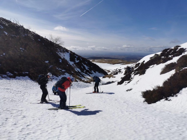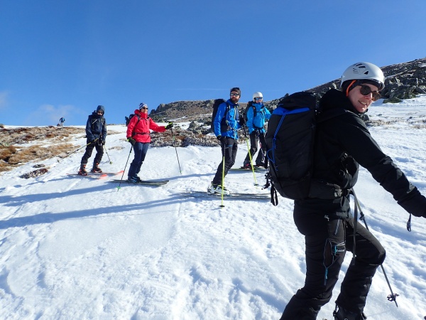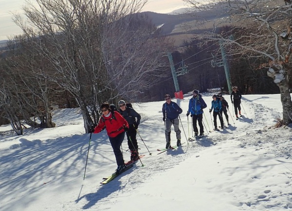 Nous poursuivons notre montée et nous nous dirigeons vers le Paillaret. Premier déchaussage pour passer une zone herbeuse. Albert, notre encadrant du jour, va voir de plus près si nous pouvons descendre en direction des pistes de ski de fond. Malheureusement, la neige se fait rare. Après avoir mis les couteaux, nous reprenons notre montée. Arrivés à un petit col, il est temps de dépeauter. Nous portons les skis pour dépasser l’herbe et trouver une zone tranquille pour pouvoir rechausser les skis et nous lancer dans cette descente verglacée. Après réglage d’une fixation, tout le groupe part pour cette descente le long d’un petit ruisseau.
