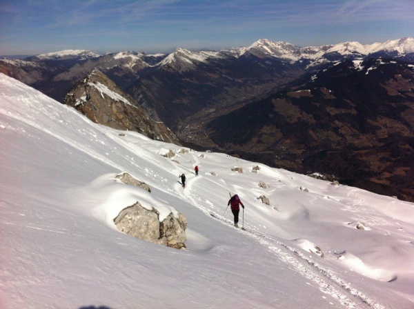La pause graines, fruits secs, glucoses en tout genre et liquide de bienfaisance s'immisce en toute évidence. Le temps est superbe, la vue se dévoile sur la chaîne des Aravis, du Charvin à la Pointe Percée, qui borde en écharpe la chaîne du Mont-Blanc. Rapidement, elle se cantonne à nouveau à la pointe de nos skis, chacun à son rythme, mais avec des points d'attente.