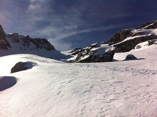 Le faible niveau nivologique oblige à une approche à pied plus conséquente, mais qui permet aux nouveaux comme moi d'échanger avec le groupe : enfants, loisirs, métiers, passions, tout y passe dans cette bonne ambiance d’une journée prometteuse. Et puis, il faut en profiter tant que le souffle le permet ! Premier obstacle et doute au niveau d'une rupture de pente : Albert se rend compte que nous ne sommes plus sur le bon chemin. Nous tentons de rejoindre celui-ci : 200 m au sud.