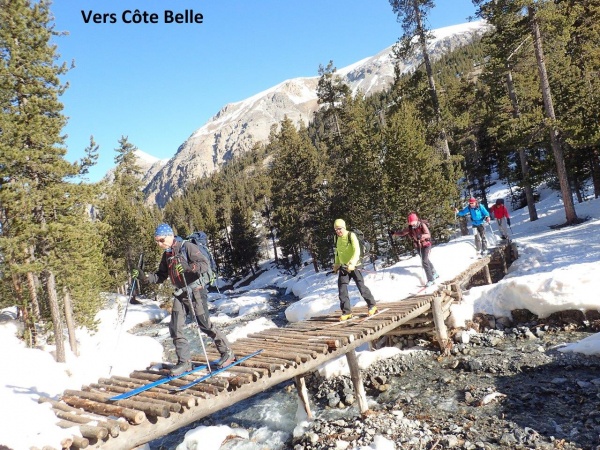 3 - MARDI & MERCREDI : départ sur la route du col de l’Izoard, en coupant quelques lacets, nous bifurquons vers les Chalets de l’Izoard, début du cirque menant au col des Peygus. Après une petite pause, nous descendons de l’autre côté du col, en bonne poudreuse, jusqu’à trouver le sentier militaire conduisant au fort de Lauzette. Nous repeautons pour rejoindre le plateau dominant le vallon de Malezen. La dernière descente vers le gîte ne nous offre pas une super neige !