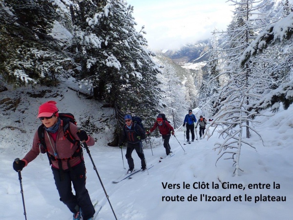 Le dernier jour sera une petite course : le Clôt la Cîme, nous empruntons une dernière fois la route du col de l’Izoard. Arrivés sur le plateau des chalets de l’Izoard, nous sommes accueillis par un vent fort. Nous nous dirigeons vers l’arête en faisant la trace dans 10 cm de neige fraîche tombée dans la nuit. La montée finale est un peu laborieuse, le vent ayant dégagé de grandes zones de pierres. Une belle descente nous ramène à la route du col de l’Izoard.