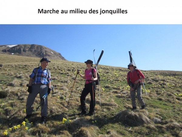 Nous partons vers 10 h du col de la Geneste (1369 m), skis sur le sac, pour une marche d’un quart d’heure environ au milieu des jonquilles,