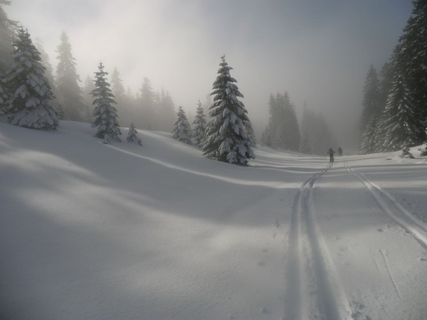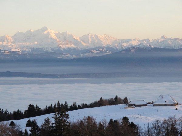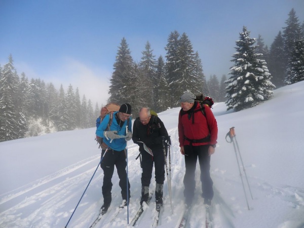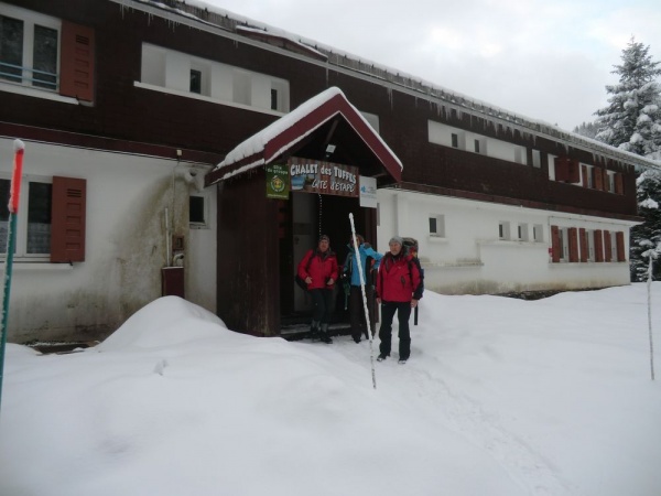 Quand nous sommes partis en direction du Jura le lundi matin, la météo et le manque de neige étaient au centre des conversations ; à l’arrivée aux Rousses, les esprits étaient chagrins, car il ne manquait que quelques vaches dans les prés pour se croire au printemps. Heureusement, en arrivant au chalet des Tuffes, le paysage ressemblait un peu plus à ce que nous étions venus chercher. Dès l’après-midi nous sommes allés faire un petit tour de ski vers le col de la Givrine : malgré quelques plaques de terre, nous pûmes nous dégourdir les skis.