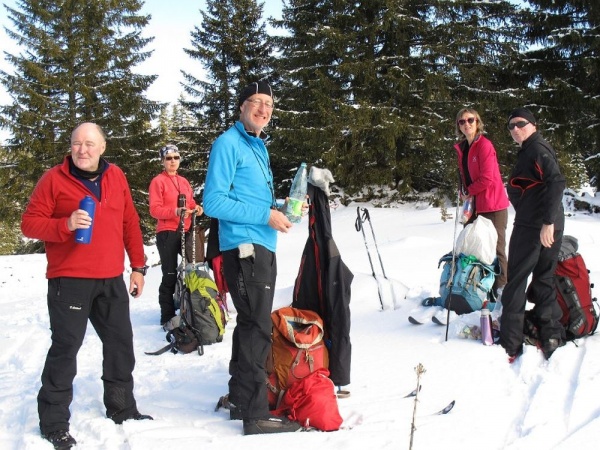 Vendredi, le départ de l’hôtel se fit entre neige et brouillard donnant une lumière superbe digne des photos de David Hamilton. Annie, désignée photographe officielle du groupe, s’en donna à cœur joie. Sous un soleil définitivement installé, nous pûmes déjeuner dehors, avant le départ de Michel et Annie pour rejoindre Clermont. Le reste du groupe rejoignit la cabane Rochefort. En arrivant, le panorama somptueux sur la chaîne des Alpes nous permit de réviser notre géographie : lac Léman, Mont Blanc, Cervin,… Juste le temps d’allumer le poêle, voilà que le groupe venu de Clermont (Fabienne, Isabelle, Hélène, Jacques, Didier et Paul) arriva avec la pulka chargée de vivres pour le samedi et le dimanche.