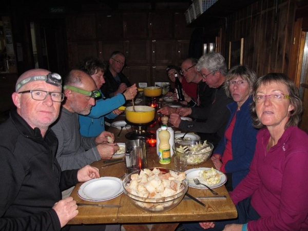 Le samedi nous partîmes tôt, la journée s’annonçait belle, même si le vent soufflait fort. Un petit tour par la cabane du Carroz, déjeûner au Creux du Croue et retour à la cabane Rochefort après 17 km et 600 m de dénivelé. La soirée fut joyeuse, la fondue et le vin blanc bien appréciés. L’anniversaire d’Isabelle put être fêté comme il se doit.