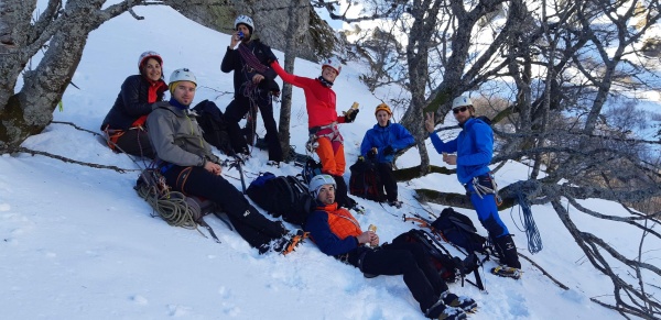 Bref, check DVA de rigueur et direction les vallons de la vallée de Chaudefour. Marche d'approche collective, puis le groupe se divise pour les premiers ateliers. Thibault met en place une moulinette sur une jolie cascade de glace, impeccable pour l'initiation, Lech et moi-même allons tâter la glace avec grand plaisir. Pendant ce temps, Julien, Fabrice, et Cédric sont en mode couloir de neige dans le vallon d'à côté ; Bernard et Aurélie, Wilfried et Virginie font un atelier cramponnage. Très studieux, tout ça ! Switch des ateliers, chaque maître distille son savoir à son ou ses padawans attitrés. C'est assez pour passer la matinée sans vraiment s'en apercevoir ! Le groupe se retrouve pour une pause repas bien méritée (bah alors, Juju, on n'a pas de sandwich ??!).
