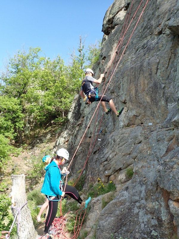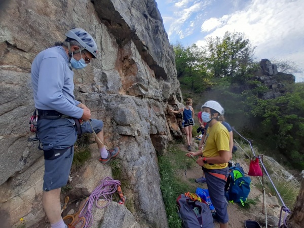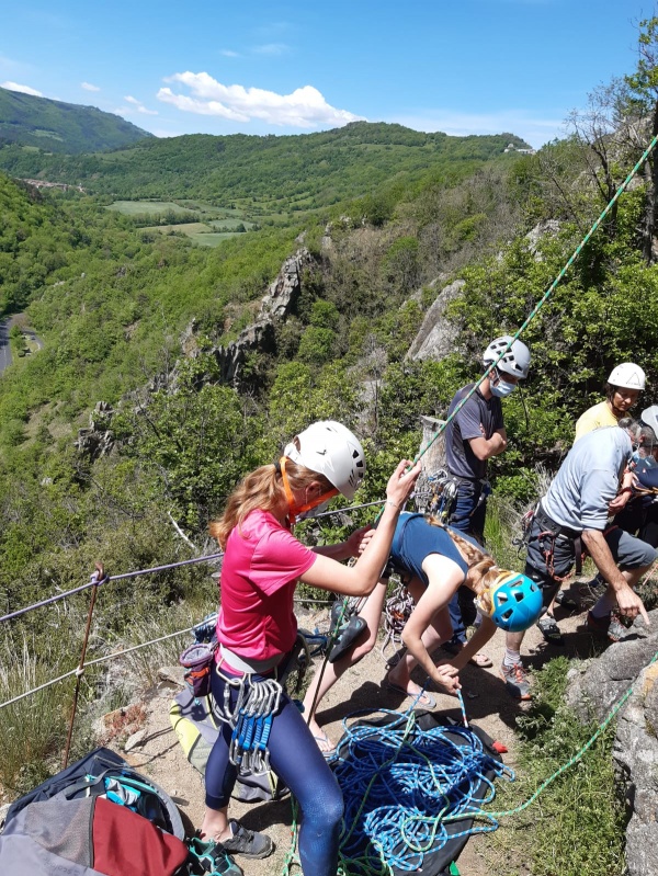 Ce dernier est néanmoins bien adapté à notre groupe, avec de nombreuses voies faciles et une belle plateforme. La grimpe, ça se mérite ! Après ce que l’on pourrait qualifier de première ascension, Jean-Louis se lance dans les explications et rappels : matériel, risques, manipulations, tout un programme ! Sans oublier la sécurité et les consignes sanitaires…