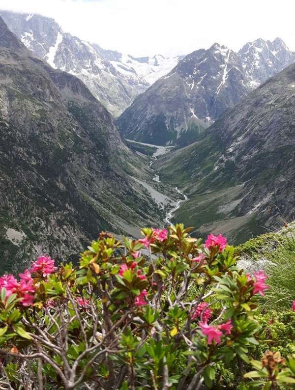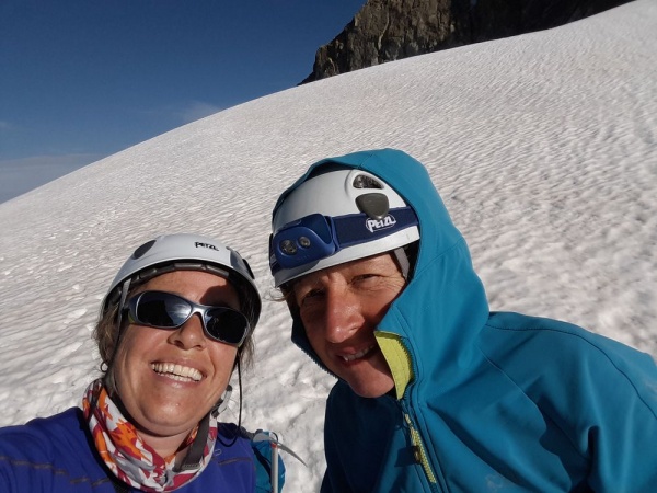 Lundi matin, départ à 4 h 30, à la frontale, pour la montée au col des Avalanches (3499 m). Après une progression sur un chemin et des rochers, nous nous équipons avec crampons et piolet, pour terminer encordés l’ascension sur le glacier. Un chamois nous indique le chemin au loin. Encore une vue magnifique au col des Avalanches, avec un beau temps dégagé. Nous sommes fiers de notre ascension et de notre belle équipe. Après une petite pause, nous attaquons la descente pour rejoindre le refuge de Temple Ecrins. Nous restons vigilants car la pente est assez raide et quelques glissades sont vite arrivées. Au refuge, nous prenons un pique-nique et une bonne tarte aux myrtilles et ne tardons pas à redescendre car le ciel se couvre. A la descente, nous admirons les fleurs de montagne et croisons quelques marmottes. Nous arrivons vers 15 h 30 aux voitures à la Bérarde et quelques gouttes nous rappellent qu’il était temps d’arriver.