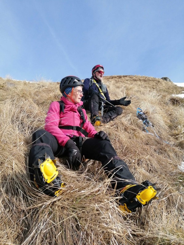 Nous nous équipons au pied des pistes encore à l’ombre, ça pique un peu mais pas pour longtemps. Nous remontons la piste noire « Mathusalem », un bon « raidard », la neige porte bien. Ensuite, nous quittons vite la piste noire (fermée) pour nous engager dans une combe d’abord arborée puis vite à découvert. Plus haut, sur la crête, Eliane aperçoit pas moins de sept mouflons. Nous prenons le temps de les observer, c’est aussi l’occasion de faire une première pause. Les mouflons passent tranquillement leur chemin. Nous reprenons notre progression et à notre gauche se dresse un couloir bien raide. L’endroit idéal pour mettre en pratique ou réviser nos connaissances. Après avoir remonté ce couloir à mi-hauteur, premier exercice d’arrêt de chute sans crampons, il faudra s’y reprendre à plusieurs fois. Pour la suite, nous formons deux cordées afin de remonter le couloir jusqu’à la crête.