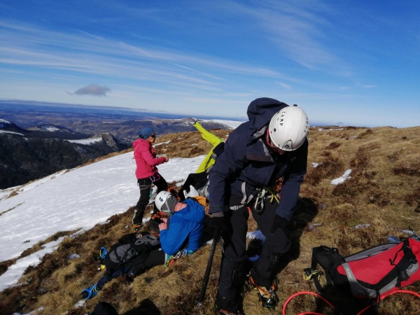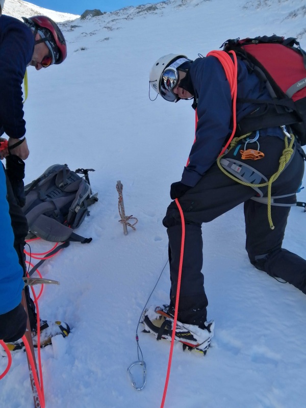 Enfin, nous prenons un couloir de descente, mais le soleil a fait son œuvre et la neige porte beaucoup moins. Didier nous propose un nouvel exercice avec une ancre à neige et un piton à neige. Nous établissons ainsi un relais. Une corde en position de rappel est installée, nous descendrons le long de celle-ci avec nos nœuds autobloquants.