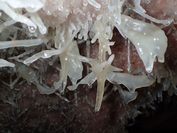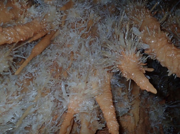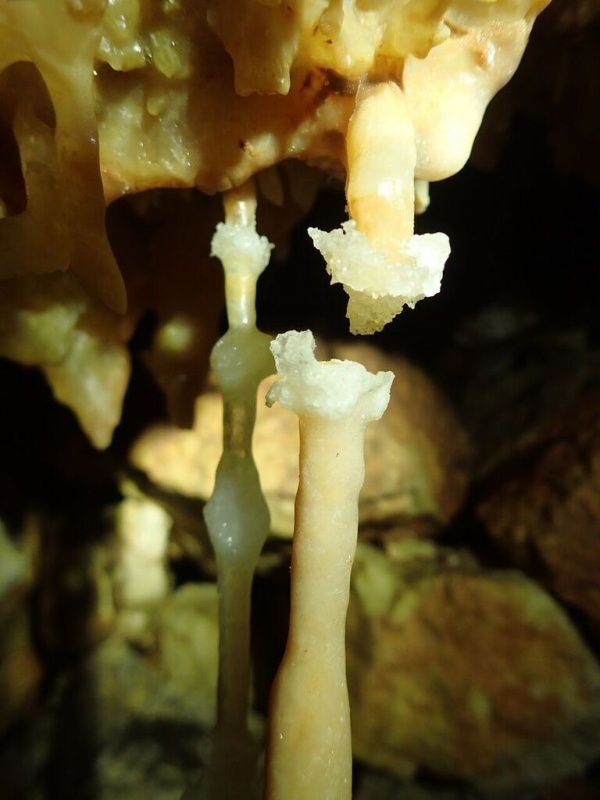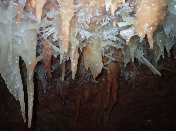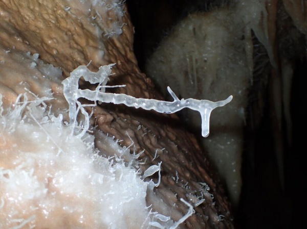 Nous arrivons sur une pente très glissante, équipée d'une corde et redescendons par un toboggan. Le plafond bas est magnifique, garni d'excentriques ; il faut faire attention de ne pas les toucher.