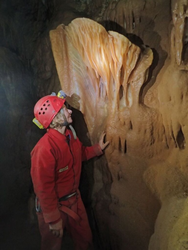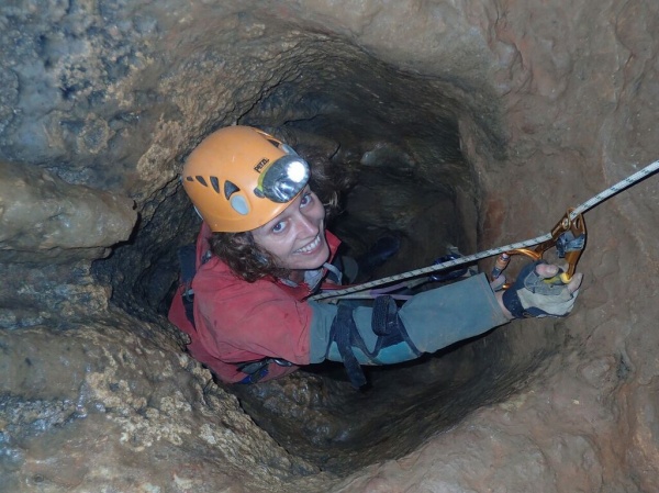 Malgré l’appréhension de la descente, je suis confiante, passe les quatre ou cinq fractionnements et la déviation sans difficulté. Il reste un ressaut et un boyau à traverser avant l’arrivée dans la grande salle.
