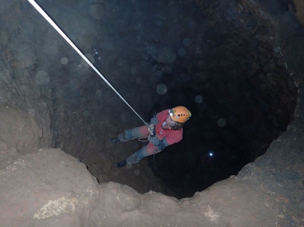 C’est parti : après le passage d’un boyau, peu étroit et légèrement en toboggan, nous arrivons en haut d'un puits, fractionné, de 31 m.