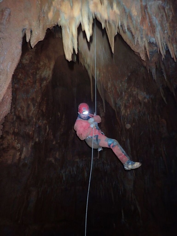 Comme la veille, Marc part devant pour équiper. Nous entrons par une faille, passons une étroiture pour arriver dans une toute petite salle qui débouche sur un puits de 45 m, fractionné. Chacun à notre tour, nous descendons tranquillement, puis plein vide pour terminer dans une grande salle concrétionnée et boueuse.