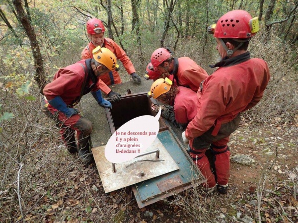 Michel descend le premier, les autres suivent. Arrive mon tour, j'aperçois quelques araignées, je ne traîne pas dans le passage afin de ne pas les déranger (surtout ne pas me retrouver nez à nez avec un énorme spécimen).