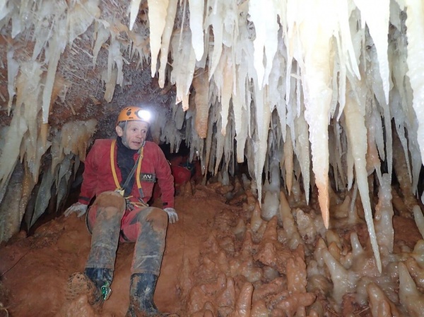 Nous traversons, presque en ramping sur le dos, une sphère de stalactites, une vraie forêt de sabres. Nous sommes fascinés.
