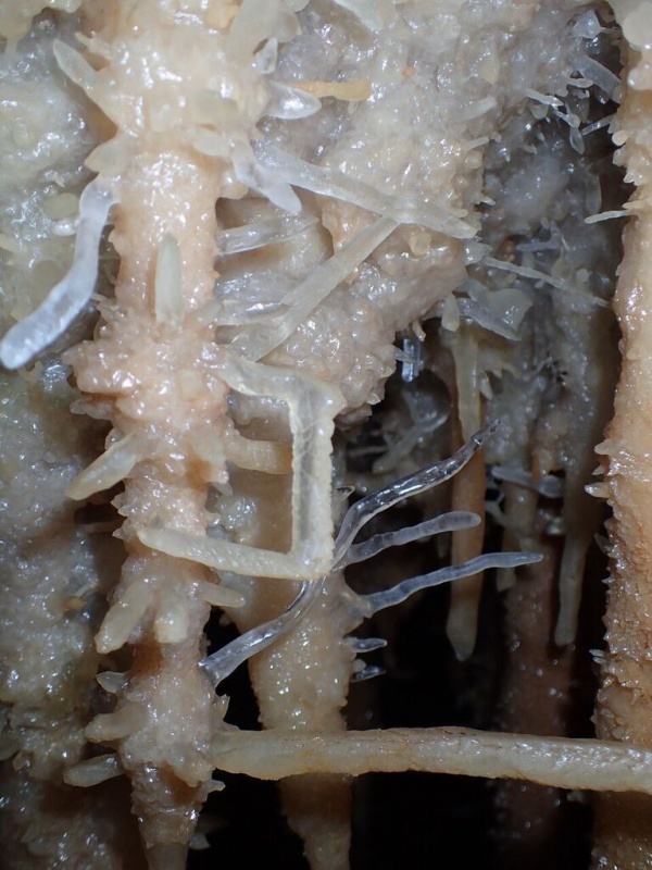 Une véritable merveille, des concrétions de calcite tout autour de nous. Je ne sais plus où poser mes yeux : des fines excentriques (stalagmites ou stalactites transparentes comme du cristal poussant à l’horizontale ou en biais) apparaissent, elles sont partout !