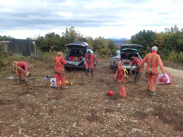 Après une courte nuit de sommeil et un petit déjeuner copieux, nous nous engouffrons dans les voitures, tous impatients de découvrir l'aven des Pèbres (profondeur - 88 m), situé sur la commune de Tharaux. A l’entrée de la grotte, nous répétons les différentes manipulations sur corde et vérifions à nouveau notre matériel pendant que Marc B. commence à équiper la cavité.