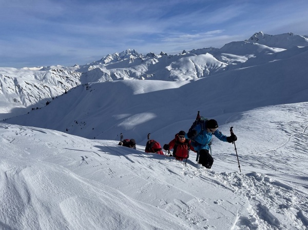 Cette matinée nous permet de faire une randonnée hors-piste à couper le souffle avec une alternance de crêtes et de sommets culminant à plus de 2 200 mètres puis une descente vers un chalet en contrebas de la montagne des Génisses (2 081 m). Petite halte pour nous restaurer avant de reprendre notre route.