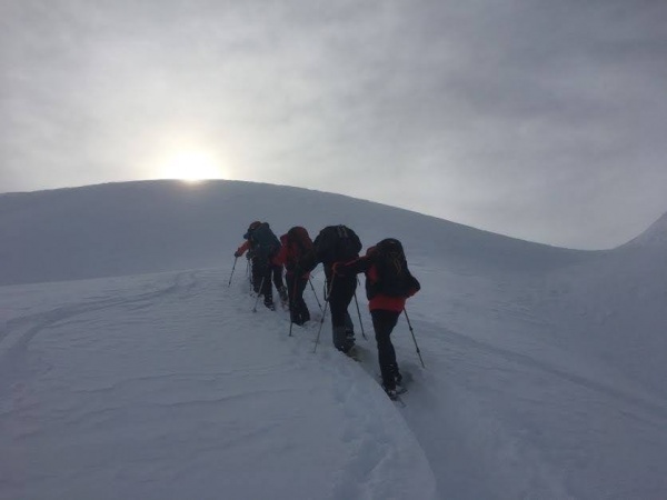 La neige étant profonde, nous nous relayons pour faire la trace et remontons jusqu’au col (2 254 m) situé à proximité de notre premier sommet gravi en début de journée.
