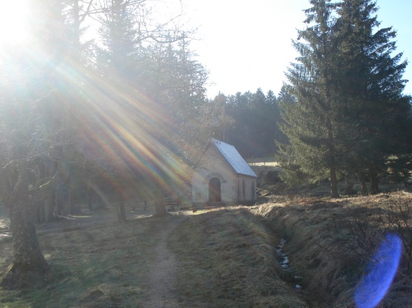 On marque un temps d'arrêt à la chapelle, puis devant la source miraculeuse, avant de franchir les différentes étapes de cette deuxième journée : la Croix St-Guillaume (1200 m), la Fontaine de Vin (1030 m) et la Chevalerie (959 m). Mais le vent se lève, le ciel s'assombrit, et nous devinons les horizons bouchés du haut du Grun de Chignore (1074 m) que nous ne gravirons pas, notre guide Christian l'ayant décidé. Peu de contestation.