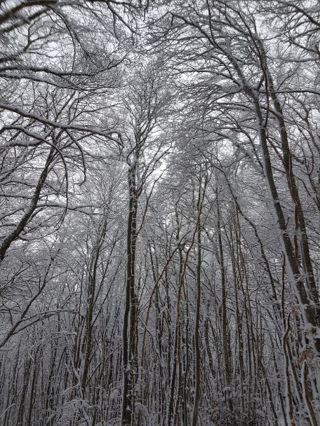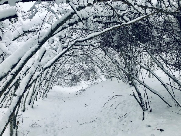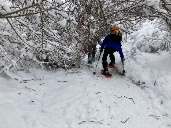 Les arbres s'inclinent sur les chemins en raison du poids de la neige, et nous voilà parfois à devoir presque ramper pour passer à travers les branchages.