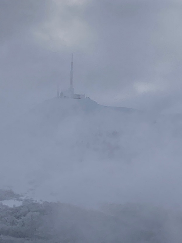 Le brouillard est au rendez-vous, mais laisse l'antenne du puy de Dôme se découvrir par moments nous offrant une image splendide, jusqu'à nous permettre d'admirer le volcan le plus emblématique du département et les grottes du Cliersou, avant de refermer son rideau.