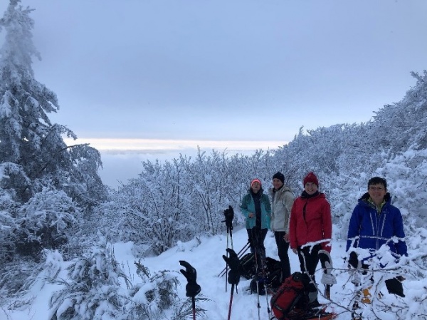 Et c'est reparti dès 9h00 en commençant par la montée du puy de Louchadière. Une belle montée en suivant un chemin forestier, puis un sentier dans lequel des petits arbres forment un couloir blanc, nous contraignant légèrement à nous courber (le sac de Sylvie a bien résisté, même à une petite branche qui y est restée accrochée !).