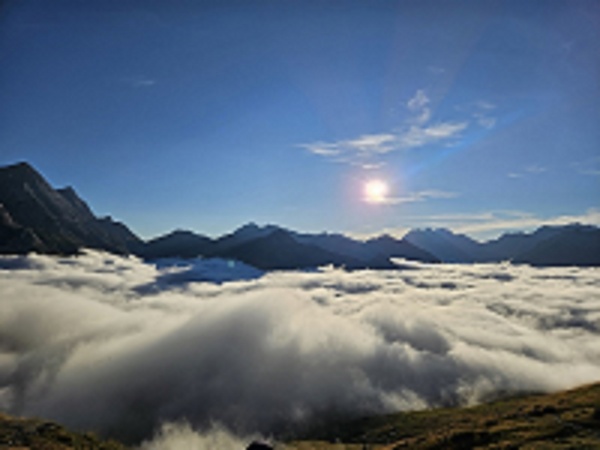 Attristés par cette nouvelle, nous décidons d’éviter les punaises du refuge des Espuguettes en plantant nos tentes au pays des tiques parmi moutons et vaches. Le refuge au crépuscule surplombe une mer de nuages d’où émerge le majestueux cirque de Gavarnie.