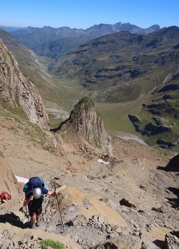 Nous saluons isards et marmottes avant de piquer droit au fond du cirque de la Pineta : 1000 m de descente, j’en ai les oreilles débouchées et la houpette recoiffée.