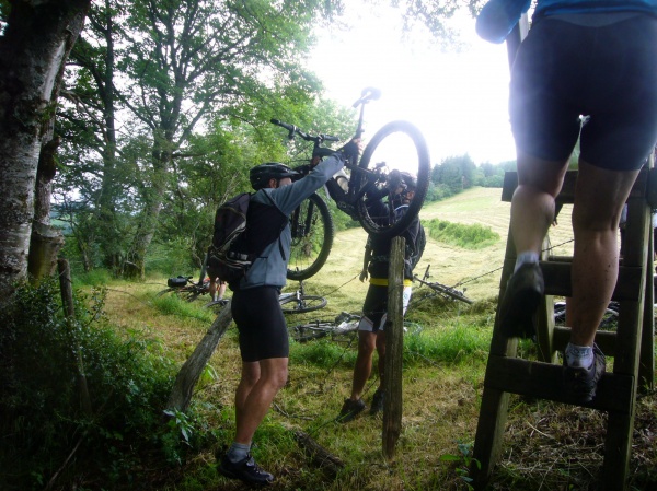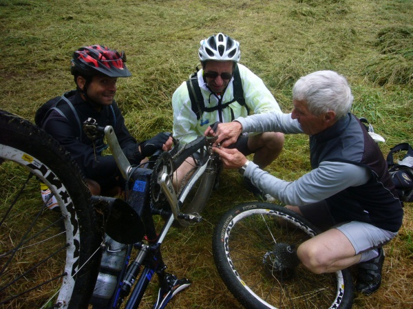 Au moment où le temps s'améliore, le premier incident mécanique se produit : alors que nous roulons dans un champ prêt à l'enrubannage, le dérailleur de Raoul se remplit d’herbes et la patte de dérailleur casse. Mais Raoul, notre guide du jour équipé de sa carte IGN maintenue par des pinces à linge, a tout l'outillage et les pièces de rechange nécessaires dans son sac à dos. Une vraie boite à outils avec même une vis pour remplacer celle qui s'est tordue lorsque la patte du dérailleur s'est sectionnée en deux.