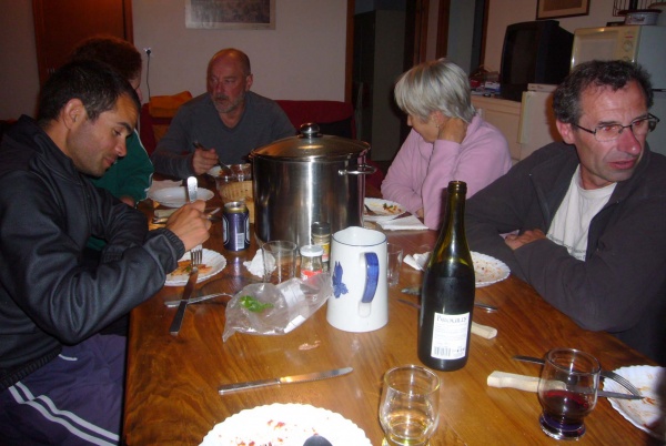 Au menu du repas de ce soir : soupe de légumes, penne all'arrabiata agrémentées de morceaux de saucisses, fromage, fruits au sirop... Un vrai festin ! Et comme un festin s'accompagne d'un bon breuvage et que nous sommes de vrais sportifs, nous avons raisonnablement descendu trois bouteilles de vin...