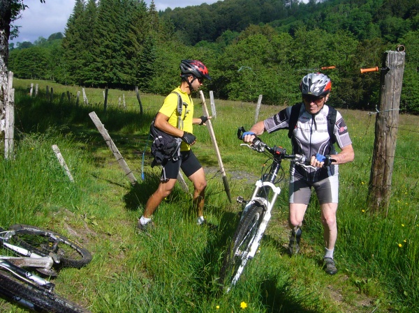 Nous passons à travers les champs clôturés, ce qui implique d'ouvrir les barrières électrifiées et c'est le début d'un festival de "Aie !". Un pour moi et trois pour Didier, notre guide du jour, qui a finalement dû remettre les fils de fer à l'aide de la pince isolante de Raoul.