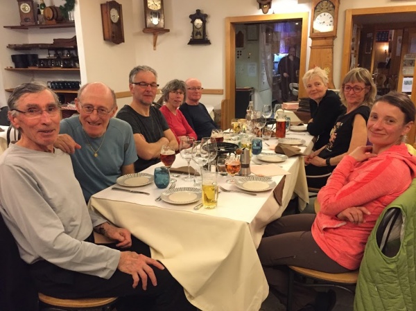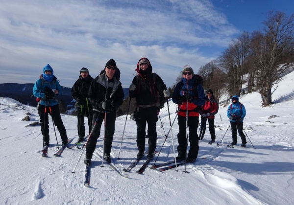 Le jeudi, motivés malgré le froid matinal et venteux, nous avons chaussé les skis nordiques en direction du col du Marchairuz, étape de 25 km, la plus longue de la traversée. Quel plaisir de découvrir, ou de retrouver pour certains, ce parcours où vallons et combes s’enchaînent. Le franchissement de quelques murets de pierres n’a arrêté personne, à chacun son style ! La neige fraîche, que nous avons goûtée sans modération, était un vrai délice, sous un soleil devenu généreux dans la journée. Quand il s’est couché, toujours sur les skis et malgré de nombreuses montées, la vaillance du groupe était intacte. Armés de lampes frontales, nous avons suivi Christian jusqu’aux lumières de l’hôtel vers 19 h, contents d’être enfin arrivés. La fondue a été engloutie sans coup férir avant une bonne nuit réparatrice.