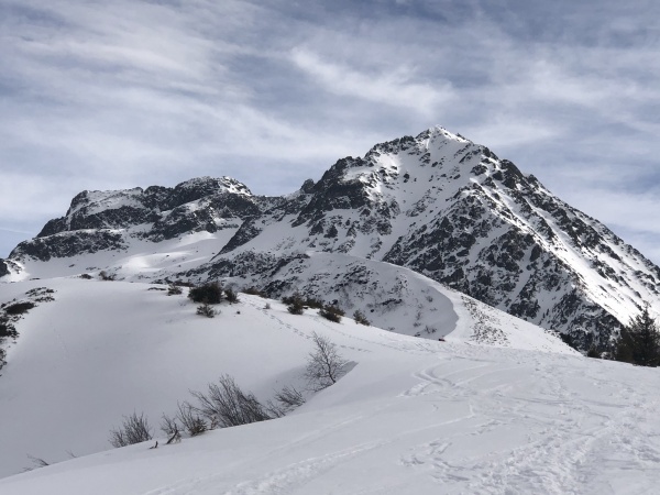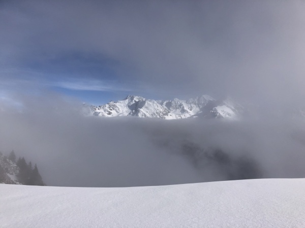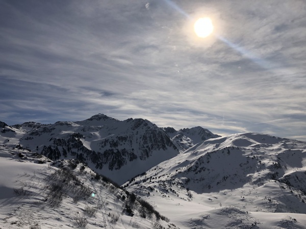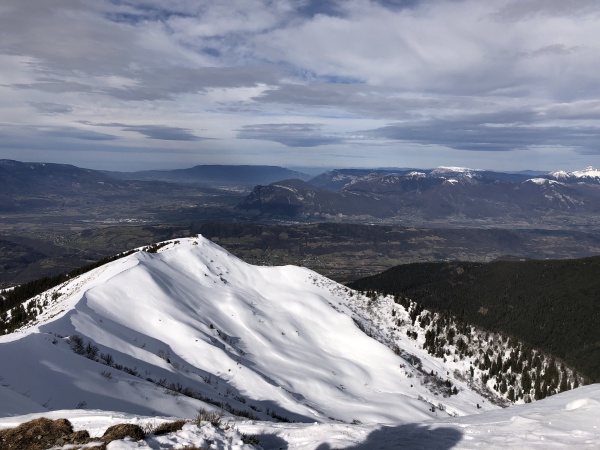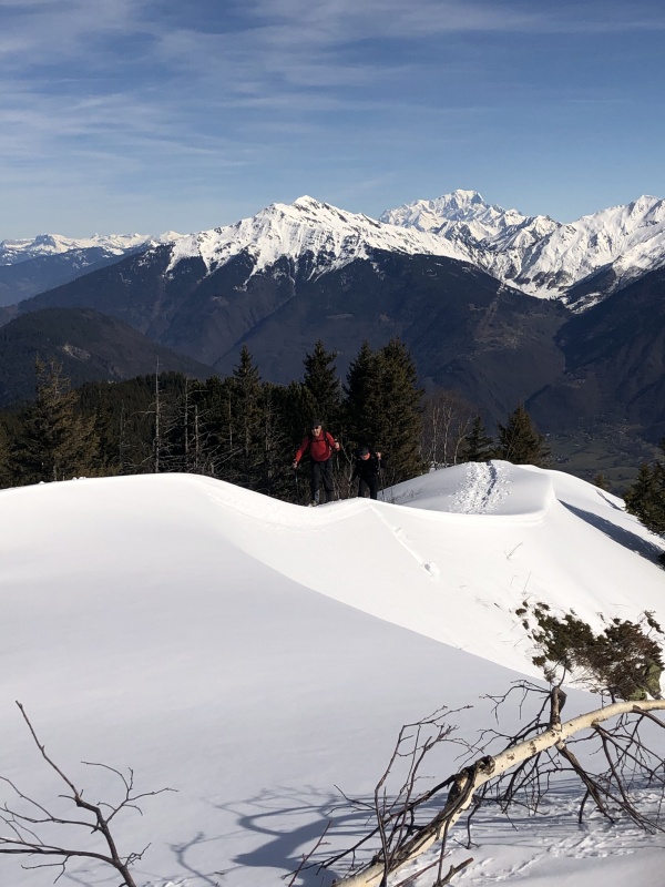 Une belle ascension dans la forêt, puis un peu de dénivelé et du dévers avant de rejoindre les crêtes et notre sommet, la Grande Montagne d’Arvillard, qui culmine et nous permet, là encore, d’avoir des très belles vues sur les massifs environnants.