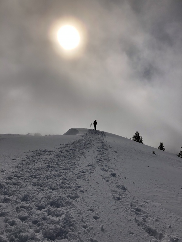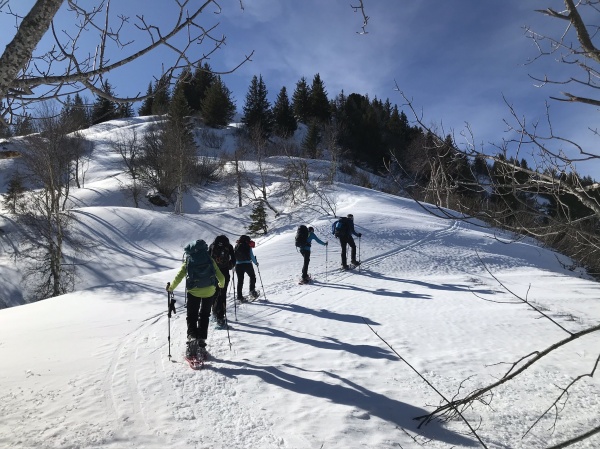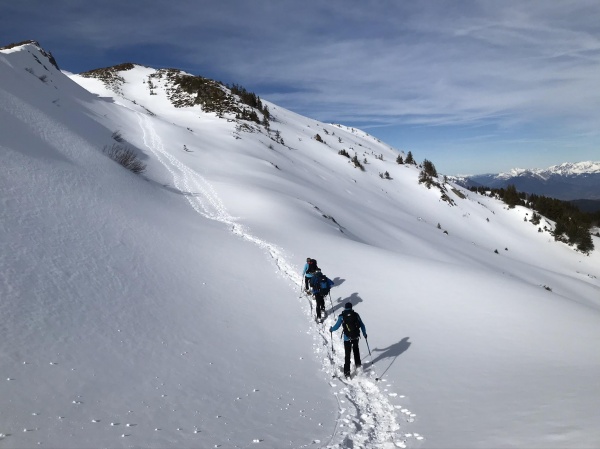 Après déjeuner, ceux qui le souhaitent poursuivent quelque temps leur chemin sur les crêtes avec quelques escapades dans la poudreuse et les sapins pendant que les autres débutent leur descente.