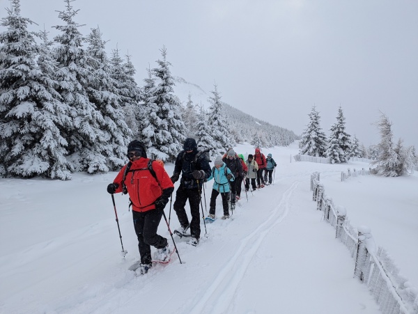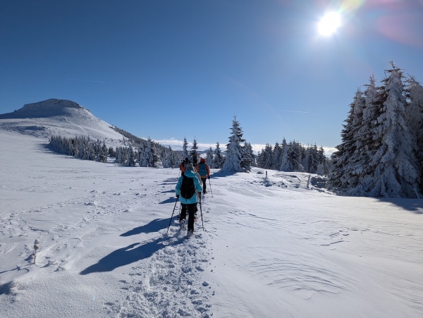 Il est 9h, ce dimanche 15 décembre, quand nos dix randonneurs à raquettes se retrouvent à Super-Besse. Tous ont hâte de fouler cette belle neige récemment tombée. Quelques rapides préparatifs, tant le froid est vif ; briefing succinct et le groupe se met en route. Après la traversée du secteur de ski de fond de la Plaine des Moutons, la troupe "prend le large" en direction du secteur très joli et sauvage au sud de la montagne de la Plate.