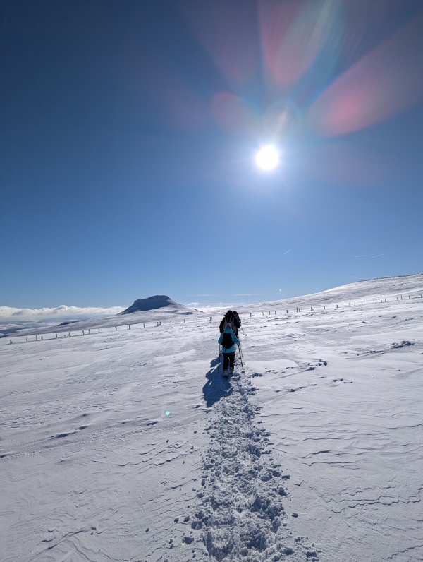 Le vent de face nous cingle le visage, la neige craque sous nos raquettes que parfois nous enfonçons profondément tant le manteau neigeux est frais. Pierrine et Guillaume sont aux manettes de la trace.