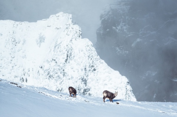 Que cela fait du bien de retrouver cette belle ambiance hivernale. Le ciel se dégage, le soleil apparait et joue à cache-cache avec les nuages. Puis tout à coup, nous apercevons des chamois non loin de nous, comme pour nous récompenser de nos efforts.
