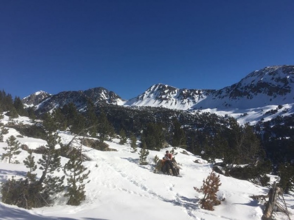 Dimanche, c’est au tour d’Emily de nous diriger dynamiquement vers le col d’Aumar : le début de la randonnée est très engageant. La neige transformée et le terrain difficile entravent notre ascension. Ensuite, le relief devient plus facile. La plupart des équipiers se relaient régulièrement pour faire la trace. Arrêt pique-nique au col d’Aumar : après avoir parcouru près de 600 mètres de dénivelé, nous reprenons nos forces afin de nous préparer à la redescente par le même itinéraire.