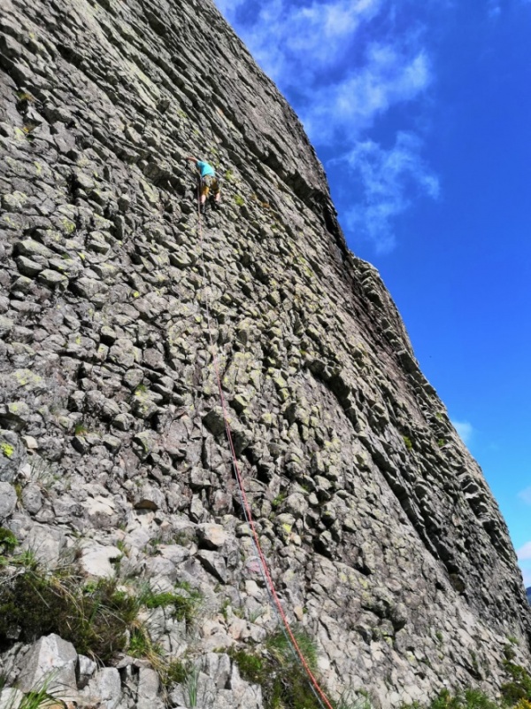 Nuit calme en dortoir, pas de ronfleur (étonnant, mais les boules Quies, ça peut atténuer…). Après avoir pris un bon petit déjeuner et pris congé de ce gîte très accueillant, sans se nous presser, nous partons vers la Bulle qui apparaît dans toute sa splendeur dans la descente du pas de Peyrol. Nous sommes les premiers au pied de la mythique voie : Raphaël grimpe en tête avec Audrey et Marc, Julien suit avec Clémentine et Coline. C’est bien au départ de la deuxième longueur que les choses se corsent, un pas un peu plus difficile qui fait chuter Audrey à deux reprises, mais ça passe. Pour Marc, c’est plus difficile et il se retrouve à un moment donné pendu comme un jambon au-dessus du vide sur une portion un peu à l’écart de la voie sans bonnes prises et, le stress aidant, c’est Julien qui vient le sortir de cette posture plutôt désagréable avec ses gros biceps. Cela tombe à pic puisque nous avions révisé la veille au gîte, sur une poutre, les mouflages : le mouflage boucle, effectivement, ça marche…