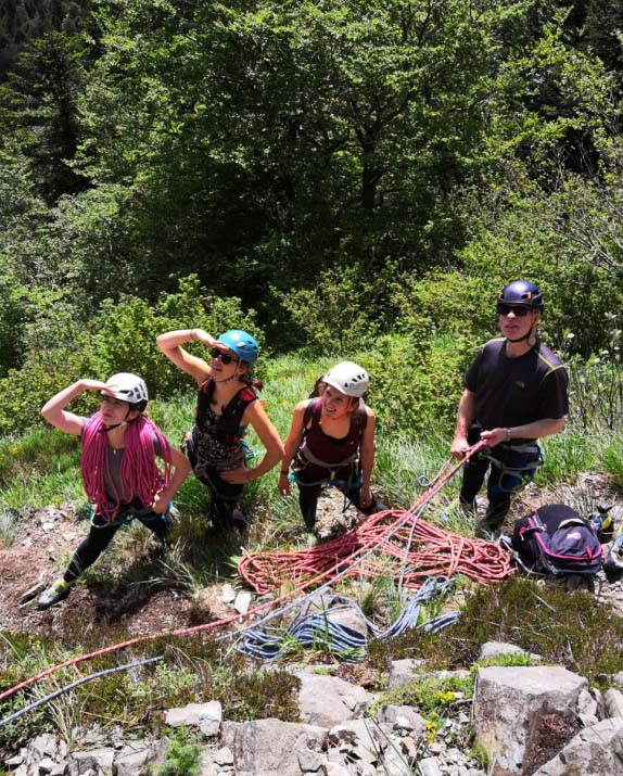 Après, c’est moins dur et les cordées évoluent vers le haut, non sans profiter du soleil aux relais, d’où quelques rougeurs sur la peau dénudée pour celles qui ont oublié la crème solaire ! Ouf, il est 15 h et la tendre herbe du sommet accueille nos pieds nus quelque peu meurtris par ces 240 m d’ascension et il est grand temps de se restaurer. Après une petite sieste, nous redescendons par un sentier plus ou moins marqué et récupérons les sacs laissés en bas de la voie.