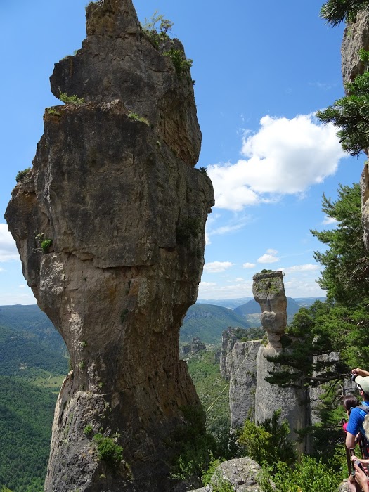 Alors que nous poursuivons notre chemin (qui était le bon ce dimanche) et suivons le circuit des corniches du Causse Méjean, c’est le feu d’artifice des vues sur les gorges. Il n’est pas question de gorge serrée, mais bien de souffle coupé devant le bien nommé « balcon du vertige » qui, par sa splendeur, nous le donne un peu. Quelques mètres plus loin, c’est le 14 juillet du panorama, le Noël des amants de la nature, face aux deux monolithes que sont le Vase de Chine et le Vase de Sèvres, rochers emblématiques de la région des Causses. Nous poursuivons par le rocher de Capluc (mot d’origine latine, Caput, Capitis = la tête, dixit Georges, notre érudit de la rando), rocher dominant les villages de Peyreleau, dans le Causse Noir, et du Rozier, sur la rive droite de la Jonte. On aperçoit Mostuéjouls – village médiéval situé à la limite de l’Aveyron et de la Lozère, en aval du confluent du Tarn et de la Jonte, niché sous la corniche du Causse de Sauveterre – Mostuéjouls et sa vue panoramique sur le château de Peyrelade.