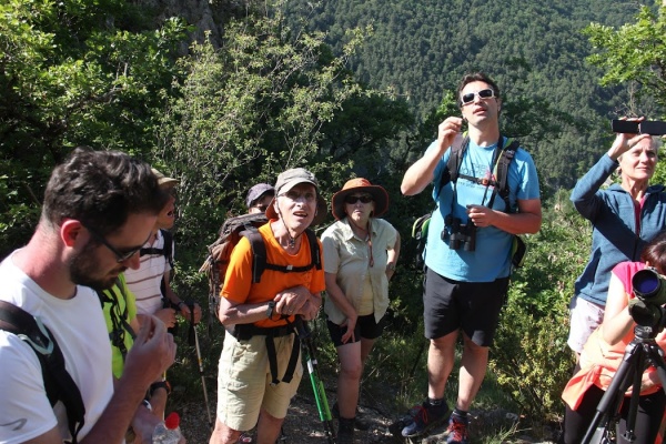 Rendez-vous sur le parking de la Maison des vautours. Nous saluons le vautour moine (Aegypius monachus), le vautour fauve (Gyps fulvus), le vautour percnoptère (Neophron percnopterus) et le gypaète barbu (Gypaetus barbatus) ; les quatre rapaces se sont réunis pour nous accueillir et nous faire visiter leurs terres. Nous passons la matinée à poser des questions, enchantés des réponses. Le chef et guide, Sylvain, nous abreuve d’informations et nous conduit au village de Cassagnes. Nous passons par le GR de pays « Tour du Causse Méjean ». Vue imprenable pendant le pique-nique. Nous croisons des marcheurs, et même Monsieur l’Agent de la Faune et de la Flore qui surveille les promeneurs(euses) mal intentionné(e)s, certain(e)s n’ayant aucun scrupule pour cueillir les jolies fleurs d’une nature précieuse – heureusement, de tels promeneurs(euses), nous n’en avons pas croisé(e)s.