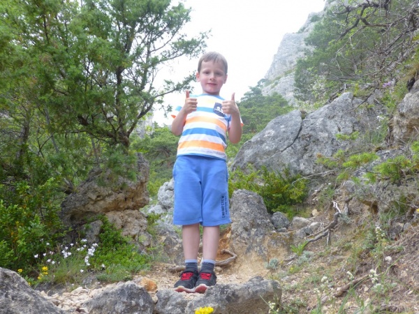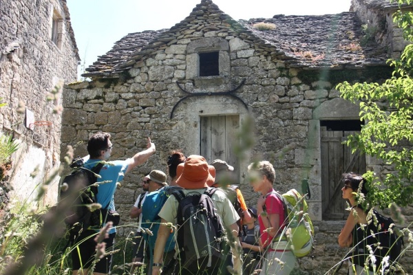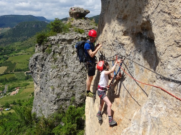 Le trotteur benjamin mène la troupe : Philippe, 5 ans, suivi de sa maman Delphine, puis Agnès, Élodie, Édith, Odile, Aurélie, Guilhem, François, Nicolas et Christian. Les 500 premiers mètres posent un premier problème d’itinéraire. Ceux qui marchent dans les ronces ne sont manifestement pas sur le bon. Les ferratistes, sans guide randonneur – eux – arrivent pourtant avant nous au lieu où nos chemins se séparent : les randonneurs suivent la montée sur le Causse de Sauveterre, traversant le village de Liaucous, pendant que les ‘via-ferrayeurs’ enfourchent baudriers, longes et chaussures appropriés, sans oublier LA poulie, qui, justement, n’a pas été retrouvée à l’issue du week-end (…).