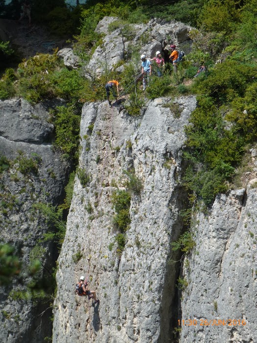 Réveil à 7 h 30. Les gorges sont toujours là. Le soleil aussi. Départ à 9 h avec notre groupe dominical : Marie-Odile, Édith, Éliane, Georges, Élodie, Odile, Agnès, Aurélie et Nicolas, Jacques, François, Christophe, Maurice et Stéphane. Absents : Guilhem, Thierry, Didier. Nous ne leur en voulons pas.